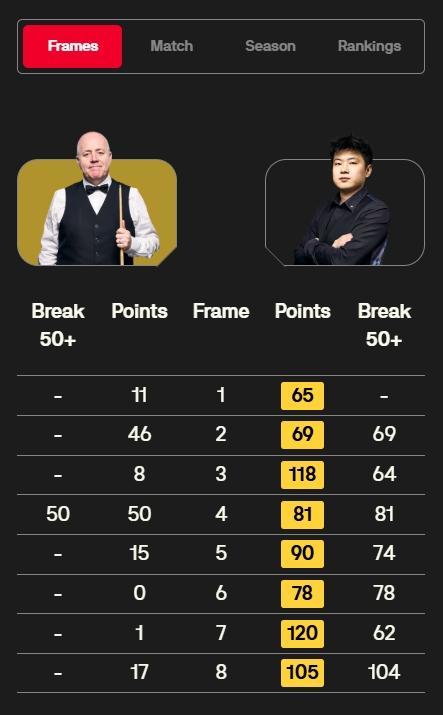 赵心童状态极佳,接连打出单杆69、64、54、81、74、78、58、62、104分,直落八局8-0领先约翰·希金斯结束第一阶段。